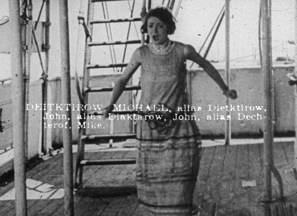 A coincidence, as fascinating and unbelievable as any in cinema’s history: the Buford, a soon-to-be-scrapped cargo ship rented by Buster Keaton as the setting for his 1924 comedy The Navigator, was five years prior the vessel used to deport Alexander Berkman, Emma Goldman, and 247 other radicals during the height of the first Red Scare. These twin voyages—a slapstick tale of two patricians who find themselves accidentally adrift, and a harrowing journey of deprivation and political repression—structure Noah Teichner’s new film Navigators, which will be screening in New York for the first time this evening. The filmmaker wends his way across the stories of the Great Stone Face and “the Soviet Ark” through a rich array of sources: Keaton’s movies, Berkman and Goldman’s writings, newsreels, press accounts of the dissident roundups, and a collection of 78s that capture the music of the era as well as its reactionary sentiments (foxtrots rub up against the likes of Irving Berlin’s “Look Out for the Bolsheviki Man”). Navigators is visually organized as a two-screen diptych, a format that allows for a complex web of correspondences to emerge between text, sound, and image. Equally notable is Teichner’s manipulation of the found footage, which he analyzes frame-by-frame through a kind of forensic poetry (the result of many hours on the optical printer at L’Abominable, the artist-run film lab in Paris). Footnotes and century-old pratfalls brim, in Teichner’s hands, with a strange new emotional life; a saga of anarchism and exile is here reanimated for a present with which it increasingly seems to rhyme.